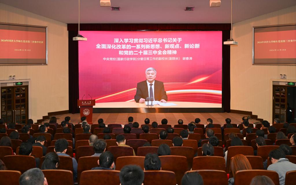 ?11月19日下午,同濟大學舉辦2024年第三次師生黨員集中培訓,全校1.5萬余名師生黨員集中觀看由中共中央黨校(國家行政學院)分管日常工作的副校長(副院長)謝春濤同志主講的“深入學習貫徹習近平總書記關于全面深化改革的一系列新思想、新觀點、新論斷和黨的二十屆三中全會精神”視頻課程。校黨委書記方守恩主持。方守恩指出,黨的二十屆三中全會是在以中國式現代化全面推進強國建設、民族復興偉業的關鍵時期召開的一次十分重...