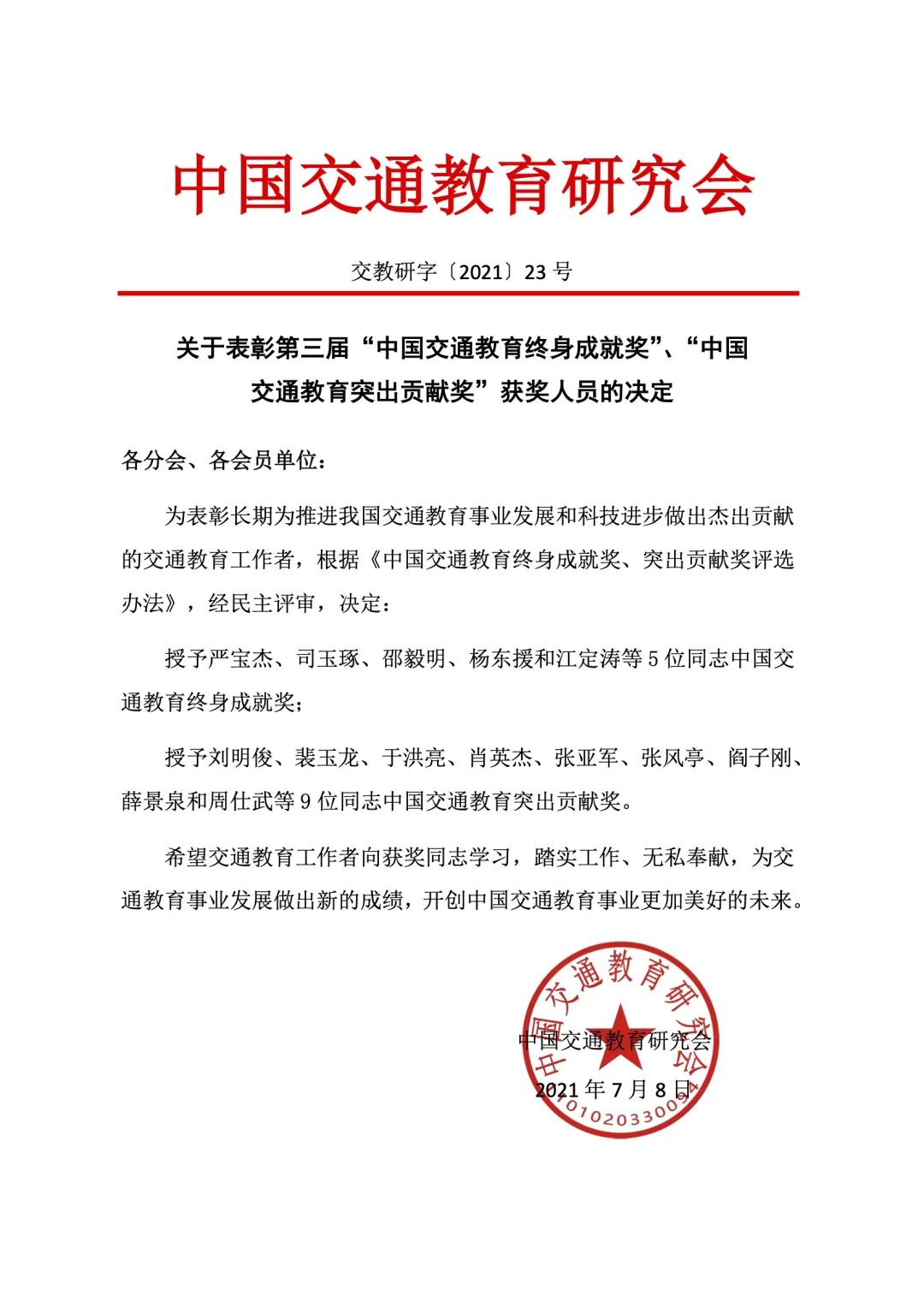 7月8日,中國交通教育研究會(huì)授予我校交通運(yùn)輸工程學(xué)院楊東援教授“中國交通教育終身成就獎(jiǎng)”,以表彰其長期為推進(jìn)我國交通教育事業(yè)發(fā)展和科技進(jìn)步作出的杰出貢獻(xiàn)。