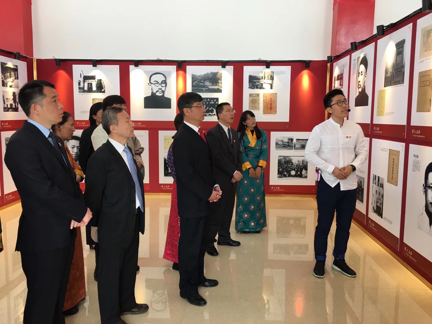 張桁嘉(右一)為西藏農牧學院師生講解“偉大開端”中國共產黨創建史圖片展