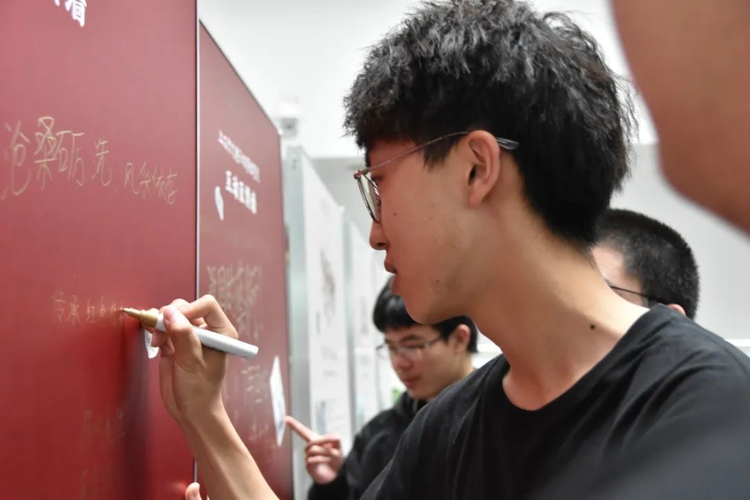 隨后,師生們沿著“崎嶇道路”紋樣的地貼動線拾級而上一同參觀了主題展,寓意重走革命道路,感悟黨初創時期的艱辛,勉勵大家帶著奮進的腳步走出最美的中國道路。在瑞安樓的中庭空間里,紅色與藍色的撞擊寓意著歷史與未來的交匯、傳統與現代的融合。展覽的丹砂朱紅底色象征著奮進新時代的精氣神,建筑線描繪出百年征程的奮進與實績。師生們紛紛表示,此次主題展有顏值、有內涵,能看、能聽且走心。