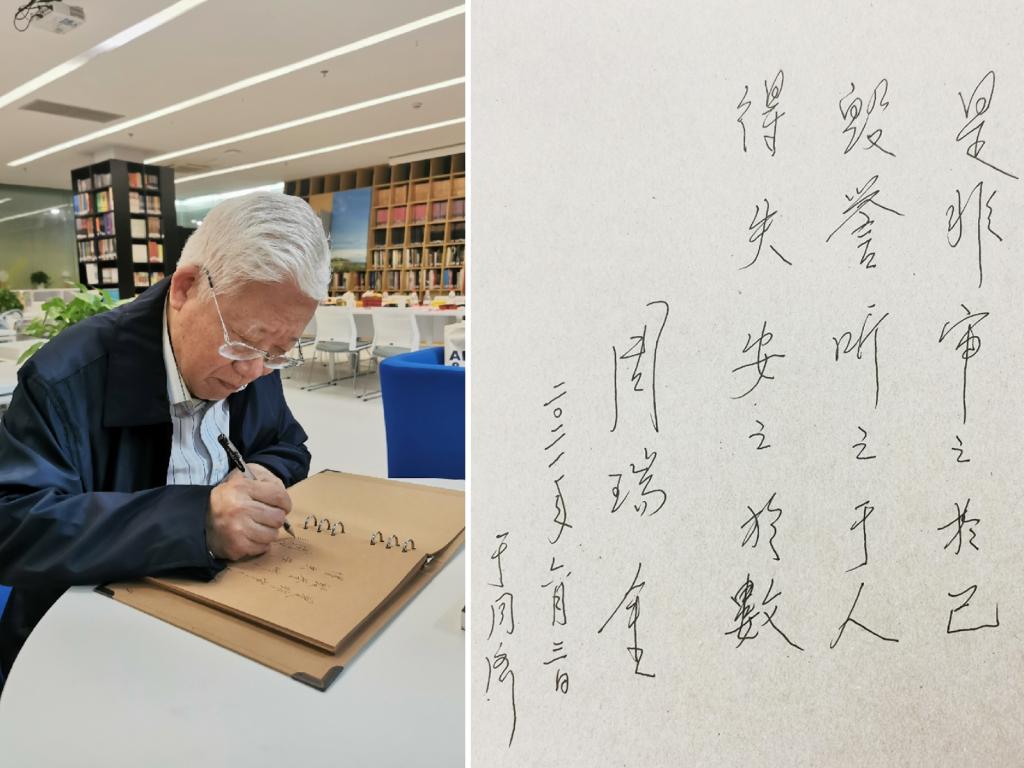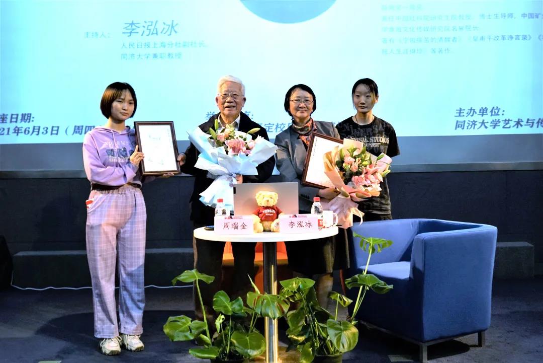 講座最后,周瑞金欣然為同濟學子寫下寄語,并贈送專著《我的報人生涯擷珍》。藝術與傳媒學院動畫專業學生將專門創作的人像速寫贈予了兩位老師。
