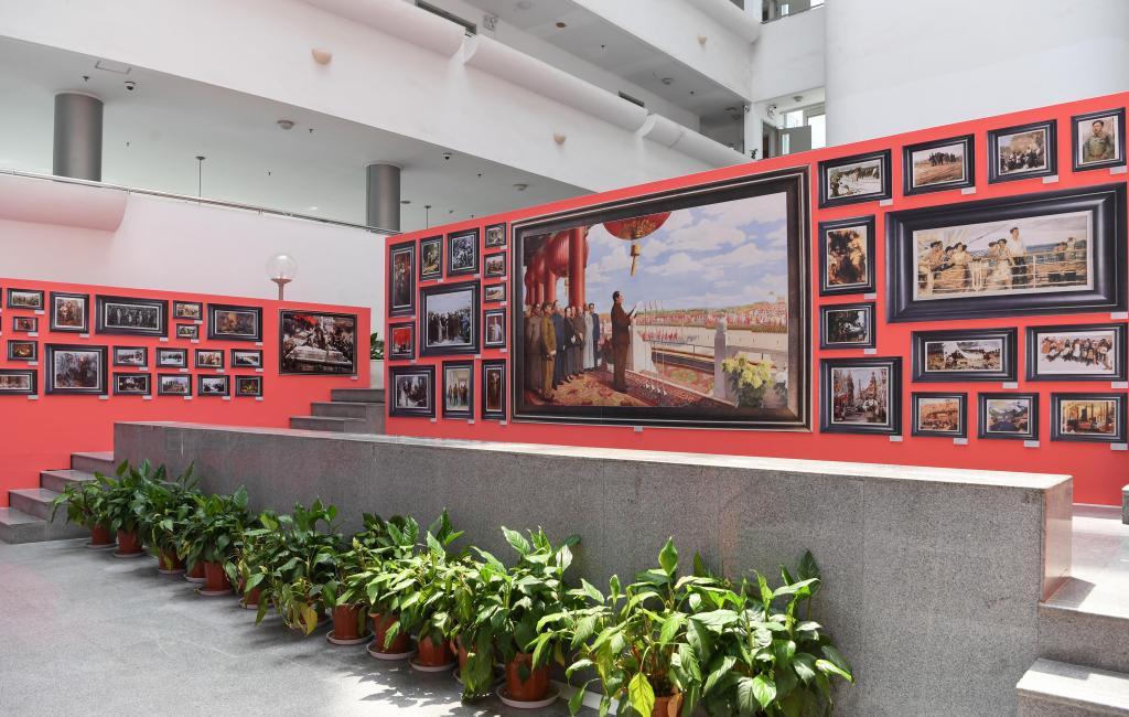 來自兩校的10余位師生在兩個月時間中,從國家發行的大量畫冊和書籍中挑選了具有代表性的118幅繪畫作品,其中包括同濟大學教師歷年來近10幅作品。展覽分為二個板塊,第一板塊從1921年中國共產黨成立至1949年新中國誕生這個時間段,第二板塊展示的是自新中國成立以來中國翻天覆地的嶄新面貌。第一板塊以油畫《啟航》為先導,集中體現了有歷史代表性的事件,包括毛澤東同志考察湖南農民運動、南昌起義、秋收起義、井岡山會師、紅軍長征、抗日戰爭和解放戰爭等,最后以《開國大典》結尾。在第二板塊中,畫于1959年的《毛主席萬歲》宣傳畫表達了新中國成立10周年時中國人民的喜悅心情;《科學的春天》表現的是全國科學大會,吹響了向科學進軍的號角;《出征》呈現的是中國人首次進軍太空的情景。